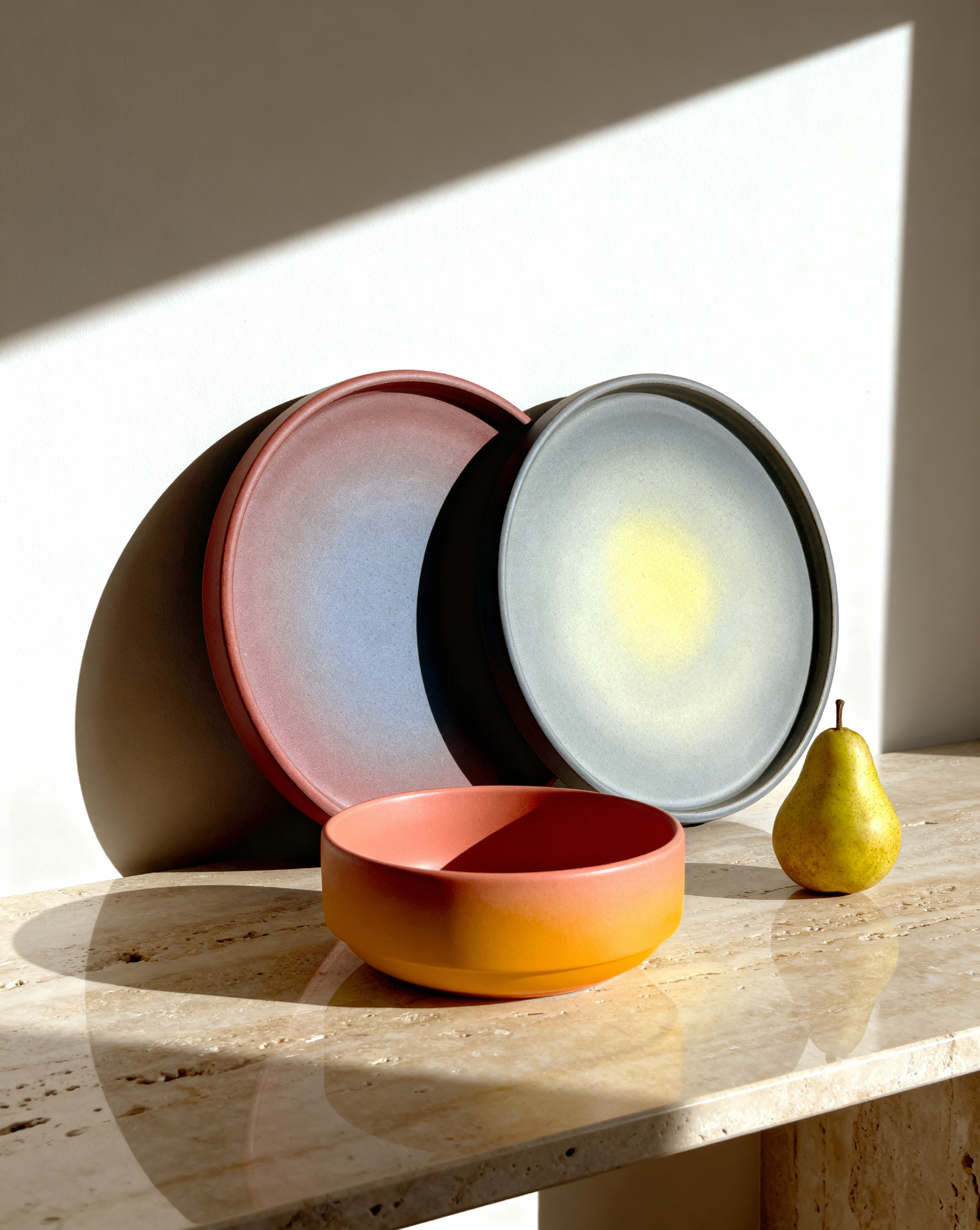 Glazed in our color Siesta — a soft blue that fades into a warm, sunlit yellow. Inspired by slow summer afternoons.